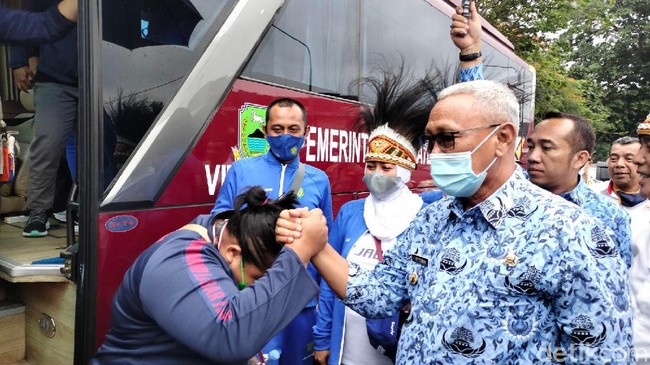 Pantauan detikcom, Senin (18/10/2021), para atlet ini tiba di kawasan Tugu Ikan Sampora Kuningan sekitar pukul 12.00 WIB. Kedatangan mereka telah ditunggu oleh ratusan masyarakat dan keluarga masing-masing.