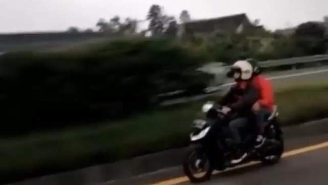 Dalam video yang beredar di medsos pada Senin (18/10/2021) terlihat dua orang menggunakan satu sepeda motor matic. Pemotor itu tampak melaju di antara kendaraan roda empat. Informasi dihimpun, sepeda motor itu masuk jalur Tol lewat Gerbang Tol Pasteur, Bandung.