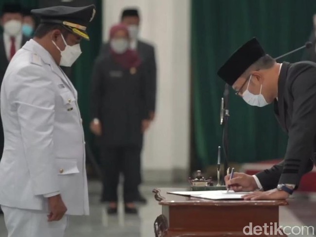 Gubernur Jawa Barat Ridwan Kamil melantik Akhmad Marjuki sebagai Wakil Bupati Bekasi di Gedung Sate, Kota Bandung pada Rabu (27/10/2021). Ia akan mengisi posisi wakil bupati untuk periode 2017 - 2022.