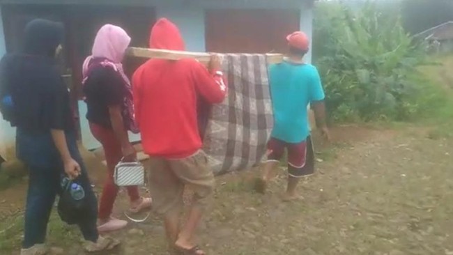 Keluarga terpaksa menandu Kakek Subarna menggunakan sarung dengan batang bambu sebagai penopangnya. Sebab kakek Subarna sudah tidak mampu berjalan akibat penyakitnya.