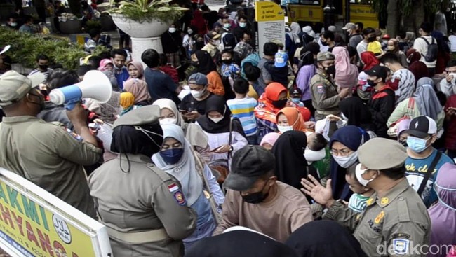 "Yang bikin berkerumun itu, karena kalau mau masuk harus scan dulu barcode-nya. Udah gitu, papan untuk scan barcode-nya setahu saya hanya satu dan itu pun kecil di titik scan-nya," ujar Widi saat berbincang dengan detikcom, Minggu (7/11/2021).