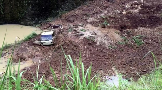 "Tinggi tebing kurang lebih 30 meter lebar 10 meter. Seluruh material longsor menimbun penambang, akibat tekanan longsor itu truk engkel terseret," kata Dody, petugas P2BK BPBD Kabupaten Sukabumi.