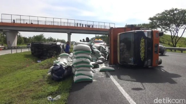 Tabrakan dua truk itu terjadi pada Senin (8/11/2021) sekitar pukul 08.00 WIB. Kecelakaan tersebut menyebabkan kedua kendaraan terguling. Truk beras terguling menutup lajur cepat sedangkan truk buah naga terguling di median jalan.