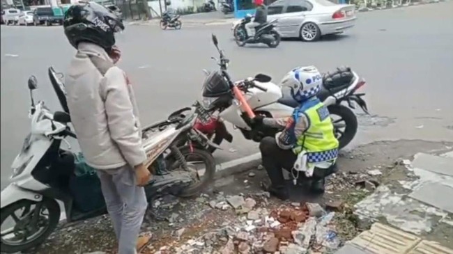 Sebagaimana dilihat detikcom, dalam video tersebut terlihat polisi berseragam satuan lalu lintas berhelm tengah berhenti di sisi jalan dengan kendaraannya. Di samping polisi, terlihat ada seorang pria dengan motor matic putih.