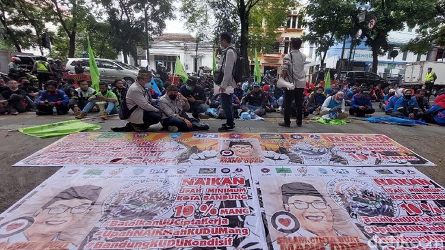 Dalam orasinya, massa aksi menuntut kenaikan UMK 2022 di Kota Bandung 10 persen. Selain itu mereka juga meminta membatalkan pengesahan UU Cipta Kerja.