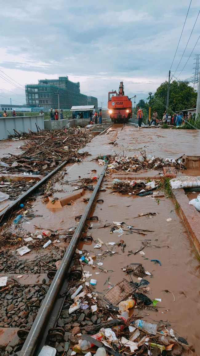Hingga pukul 19.40 WIB, Kuswardoyo mengatakan ketinggian air masih 10 sentimeter di atas rel kereta api. Imbas dari tertutupnya rel, sejumlah perjalanan kereta api tertahan.