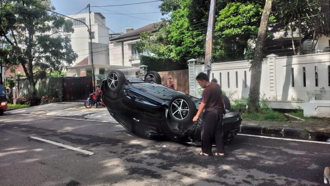 Sebuah mobil mini SUV mengalami kecelakaan tunggal hingga terguling di Jalan Lombok, Kota Bandung, Senin (29/11/2021) pagi. Polisi menduga kejadian tersebut dikarenakan pengemudi mobil mengantuk.