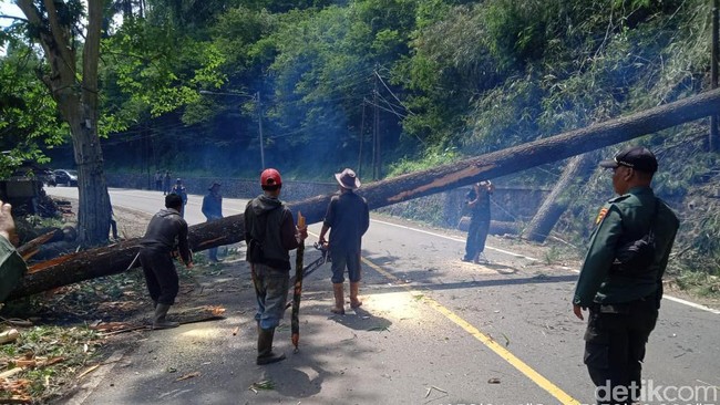 Ia mengatakan, pohon yang tumbang diantaranya dua pohon pinus disertai pohon bambu yang ada disebelahnya. Selain pohon-pohon itu menutup akses jalan, rimbunanan ranting dari pohon bambu sempat menimpa seorang pengendara motor hingga terjatuh.
