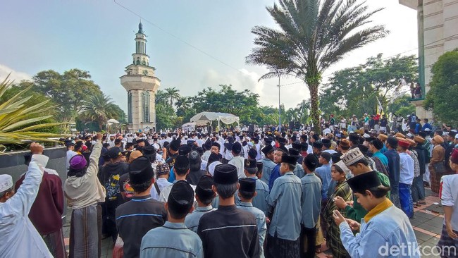 Massa dari berbagai daerah di Priangan timur mengikuti tasyakur Reuni 212 di Masjid Agung Ciamis, Kamis (2/12/2021). Para ulama dan santri ini berasal dari Ciamis, Banjar, Pangandaran, Tasikmalaya, Garut dan Sumedang.