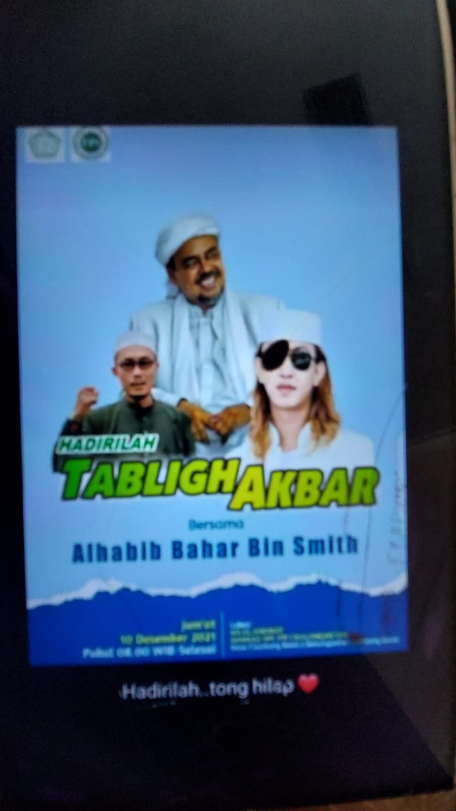 Agenda kegiatan tabligh akbar bersama Bahar bin Smith yang digelar pada Jumat (10/12/2021) itu juga ramai dibagikan di media sosial itu. Dalam posternya ditampilkan juga gambar sosok Rizieq Shihab.