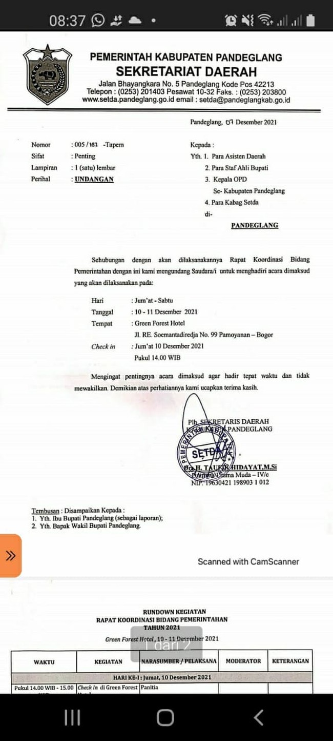 Belakangan diketahui, agenda tersebut ternyata merupakan rapat koordinasi (rakor) bidang pemerintahan. Agenda itu pun tertuang dalam surat Pemkab Pandeglang berkop Sekretariat Daerah dan ditandatangi langsung oleh Pj. Sekda Pandeglang Taufik Hidayat pada tanggal 7 Desember 2021.