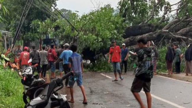 Pohon mahoni raksasa itu menimpa dua rumah warga yang ada di dekatnya hingga menyebabkan kerusakan cukup parah. Seorang warga mengalami luka ringan akibat terkena material rumah yang tertimpa pohon.