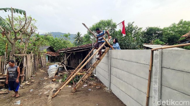 Sebuah tangga dari kayu kemudian dibuat oleh warga seadanya yang menjadi akses melintas terdekat menuju Jalan Raya Rawakalong. Pantauan detikcom, tembok beton itu setinggi kurang lebih dua meter.