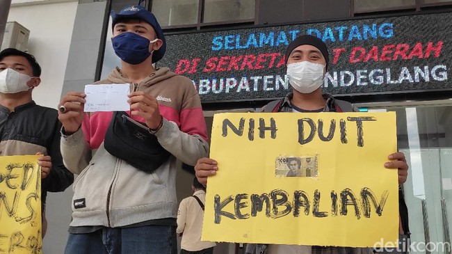 "Kedatangan kami sebagai bentuk kecaman terhadap Kadispora Pandeglang sekaligus mengembalikan uang kelebihan untuk bayar pajak negara yang sudah dia ungkit dalam acara Bupati Cup," kata warga bernama David Amanda ditemui di Pandeglang, Banten, Senin (20/12/2021).