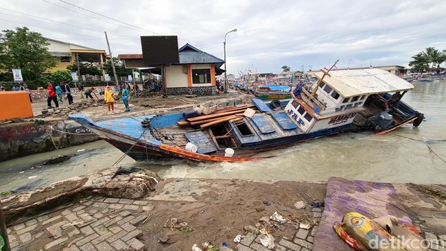 "Posisi perahu sedang docking, kemarin sudah dua hari karena banjir sangat deras air tidak tertahan melimpah ke atas membuat tanggul jebol," kata Teli Supriatna, pemilik perahu kepada detikcom, Jumat (24/12/2021).