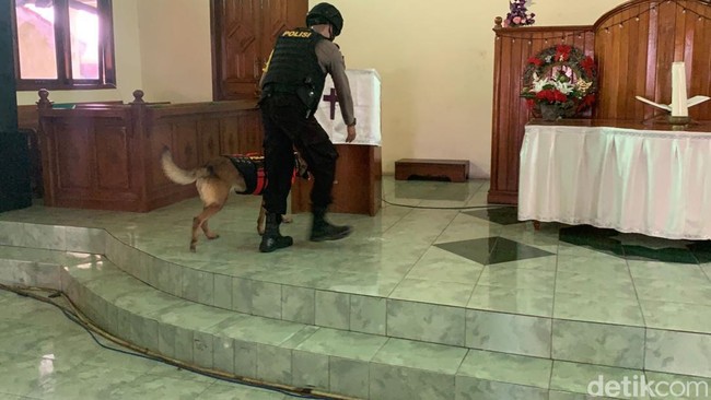 "Untuk unit K-9 tidak hanya memeriksa bagian dalam gedung. Tapi juga halaman dan tempat parkir setiap gereja dilakukan penyisiran oleh dua ekor anjing pelacak," jelasnya.