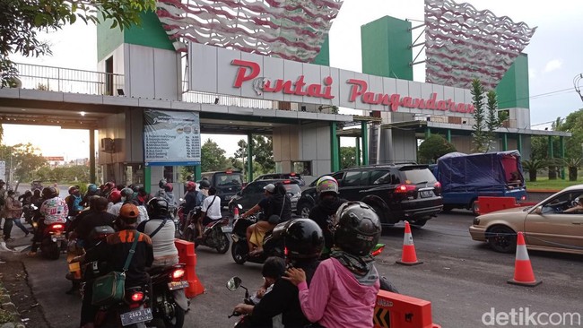 Menjelang malam momen pergantian tahun, gelombang wisatawan yang tiba di Pantai Pangandaran mulai menunjukkan peningkatan yang signifikan. Suasana di gerbang utama yang sejak pagi hingga petang relatif landai, berubah menjadi ramai. Mayoritas kendaraan wisatawan menggunakan sepeda motor.
