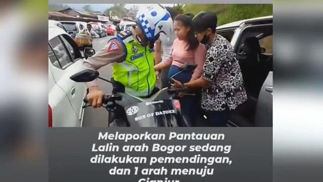 Dalam tiga buah video yang tersebar di media sosial tampak para anggota polisi tersebut awalnya membawa seorang ibu yang tengah dalam kondisi hamil membawa sepeda motor matic. hal itu dilakukan lantaran mobil yang membawa ibu hamil yang mengarah ke Bogor itu terjebak kemacetan parah di kawasan puncak tepatnya di Desa Ciloto Kecamatan Cipanas.