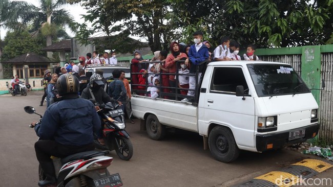 Pantauan detikcom, ada dua mobil bak terbuka yang digunakan oleh para siswa dan didampingi oleh orang tuanya masing-masing. Layaknya yang hendak berangkat ke obyek wisata, para siswa ini bernyanyi dengan riang walaupun hanya menaiki mobil bak terbuka.