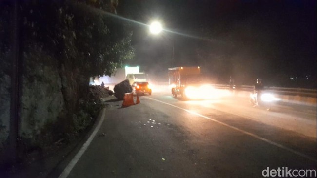 Dari pantauan detikcom di lokasi bongkahan batu sebesar minibus jatuh hingga menutupi setengah badan jalan. Akibatnya arus lalu lintas di kawasan Cadas Pangeran pun terpaksa diberlakukan buka tutup atau one way.