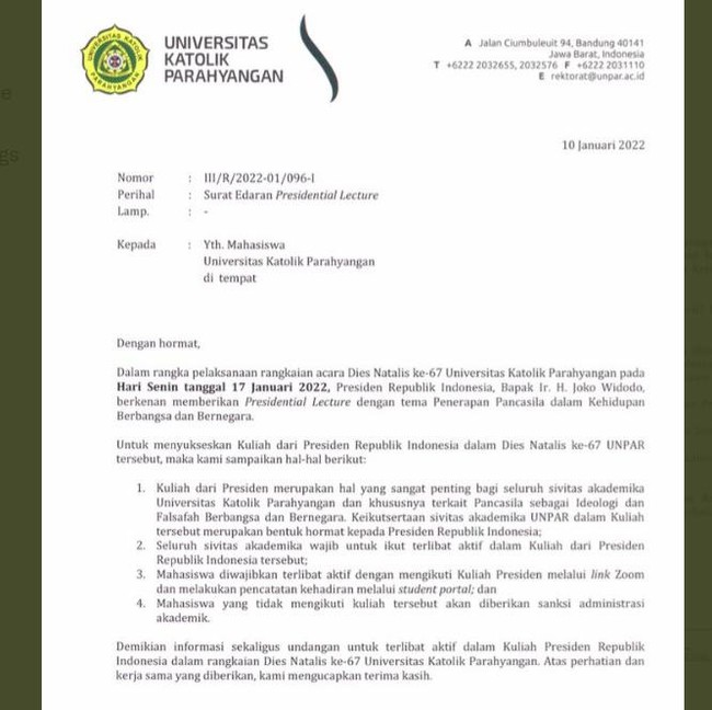 Media sosial Twitter diramaikan dengan Surat Edaran Universitas Parahyangan Nomor III/R/2022-02/096-I. Surat tersebut mewajibkan mahasiswa hadir saat Presiden Joko Widodo (Jokowi) memberikan kuliah dalam rangkaian acara Dies Natalis ke-67 Unpar yang akan digelar pada Senin 17 Januari 2022.
