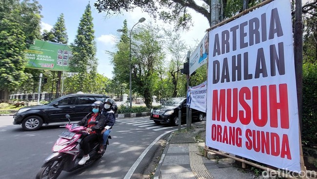 Baliho bertuliskan 'ARTERIA DAHLAN MUSUH ORANG SUNDA' mejeng di Kota Bandung, tepatnya di pertigaan Jalan Diponegoro di dekat Gedung Sate pada Rabu (19/1/2021).