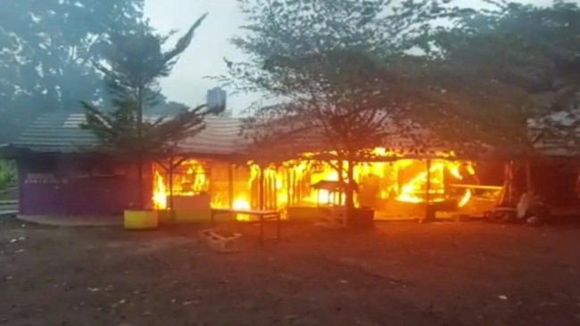 Api melalap 10 kios yang berada dalam satu lokasi di kawasan Bendung Manganti, Kabupaten Ciamis, Jawa Barat, Sabtu (29/1/2022) pagi. Sumber api diduga akibat korsleting.