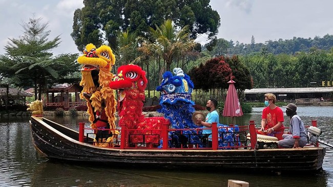 Tiga barongsai berwarna merah, kuning, dan biru melenggak-lenggok hingga melompat kesana-kemari demi menghibur wisatawan yang sedang menghabiskan waktu liburan di kawasan wisata Lembang, Kabupaten Bandung Barat (KBB).