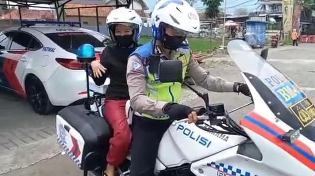 Saat itu anggota tengah melaksanakan pengamanan arus lalu lintas akhir pekan. Sang ibu tiba-tiba menghampiri petugas dan langsung meminta dibonceng naik motor patroli.