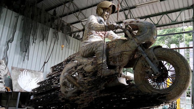 "Maka dari itu saya terjemahkan beliau suka naik motor dengan kecepatannya. Jadi patung ini sebagai apresiasi saya kepada beliau. Ini juga kaitannya dengan akselerasi beliau dalam bekerja seperti naik motor, cepat," ujar seniman berusia 70 tahun ini menambahkan.