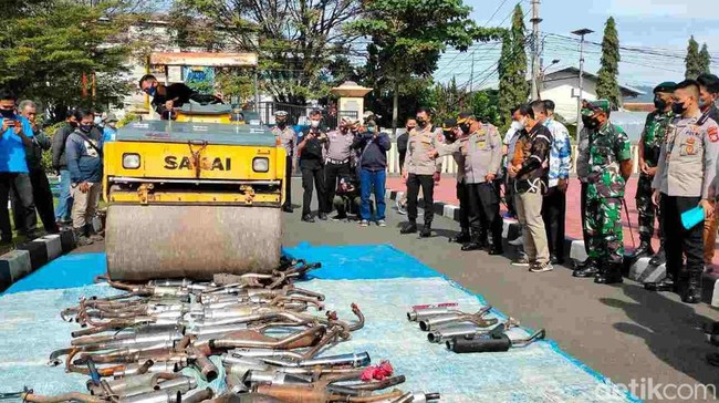 Pemusnahan barang bukti knalpot bising itu dipimpin langsung Kapolda Jabar Irjen Suntana yang didampingi Kapolres Sumedang AKBP Eko Prasetyo Robbyanto, Bupati Sumedang Dony Ahmad Munir dan Wakil Bupati Sumedang Erwan Setiawan. Knalpot-knalpot hasil dari razia yang terkumpul dihancurkan dengan menggunakan kendaraan berat.