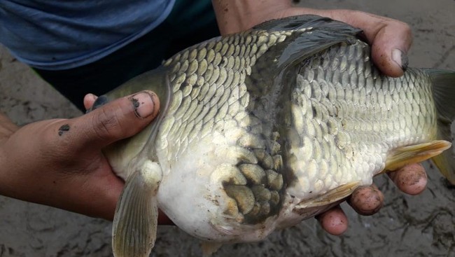 Tubuh ikan pun tampak lebih besar dari yang biasanya. Bagian perutnya terlihat menggelembung dan lebih besar.