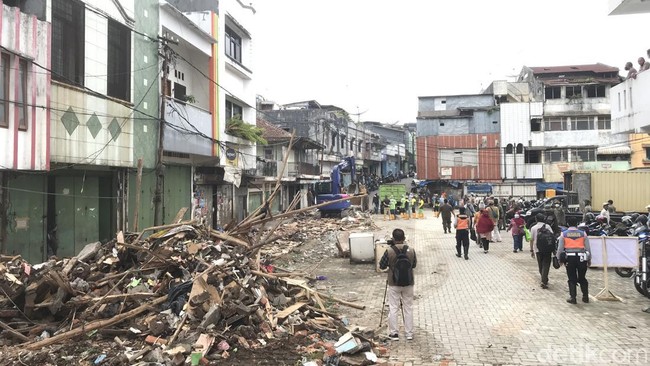 Pantauan detikcom di lokasi, terlihat beberapa petugas berjaga di sekitar gedung Pasar Pelita. Pedagang juga hilir mudik dari dalam gedung Pasar Pelita ke lapaknya.