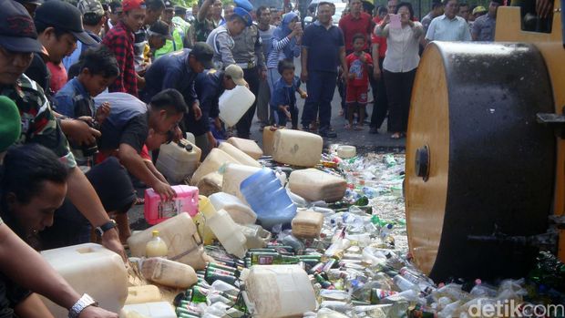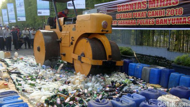 Pemusnahan tersebut digelar di ruas Jalan Karangkobar, depan Taman Rekreasi Bale Kemambang, Purwokerto, Kabupaten Banyumas, Minggu (5/6/2016) dengan cara digilas menggunakan "stoomwals". Tujuannya agar masyarakat dapat melihat dan ikut memusnahkan miras menjelang bulan Ramadan.