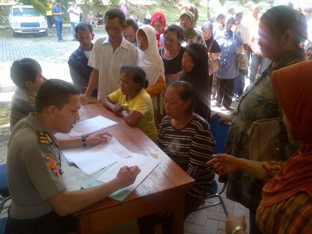 Diah dan seratusan warga lainnya memanfaatkan program bakti sosial dan pengobatan gratis massal yang diadakan Sekolah Inspektur Polisi Sumber Sarjana (SIPSS). Para warga sama sekali tidak dipungut biaya.