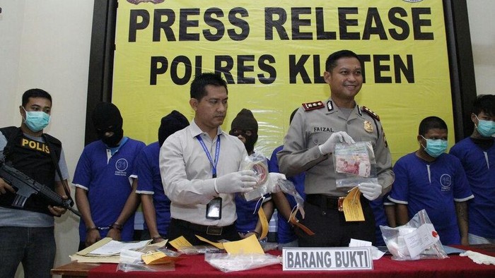Kasat Narkoba Polres Klaten, AKP Danang Eko Purwanto, memaparkan bahwa dari sembilan tersangka diamankan barang bukti berupa narkotika golongan I jenis sabu dengan total 1,37 gram, handphone berbagai merk, uang tunai, ribuan butir pil psikotropika dan obat-obatan terlarang serta berbagai alat yang digunakan untuk mengkonsumsi narkotika dan psikotropika.