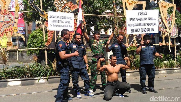 Mereka membawa poster bertuliskan 'Jangan Suka mbaca Berita Hoax, mbikin Situasi Kacau, Cen berita Hoax itu Emboeh Criiiit', juga poster berisi 'Waspada Upaya Perpecahan Bangsa, Geloraka Semangat Persatuan, Bhinneka Tunggal Ika'.