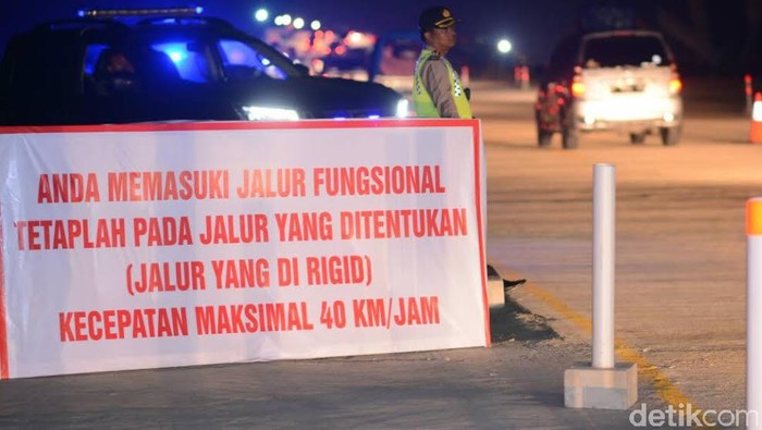 |  Seorang petugas di jalan fungsional Brebes, Kamis dinihari. (Foto: Imam Suripto/detikcom) |