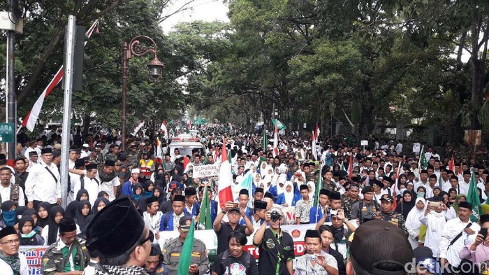 Massa berjalan sepanjang sekitar 3 km, mereka menyanyikan lagu patriotik NU dan lagu-lagu perjuangan Indonesia. Di sela-sela nyanyian, mereka juga memekikkan takbir dan slogan 'NKRI Harga Mati'.