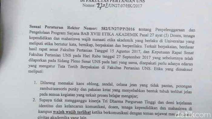 Adapun surat edaran tersebut berisi peraturan tentang etika berpakaian selama berada di kampus FP. Etika yang dimaksud dituliskan dalam dua poin.
