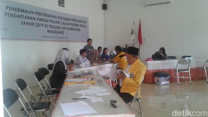 "Sembilan parpol yang mendaftar hingga hari ini diantaranya Perindo, PKS, Nasdem, Golkar, Partai Solidaritas Indonesia (PSI), Gerindra, Garuda, Demokrat, PPP. Tiga parpol diantaranya merupakan partai baru, yakni PSI, Garuda, dan Perindo," jelas Komisioner KPU Kabupaten Magelang Divisi Sosialisasi dan Partisipasi, Dwi Endis M, kepada detikcom, Senin (16/10/2017).