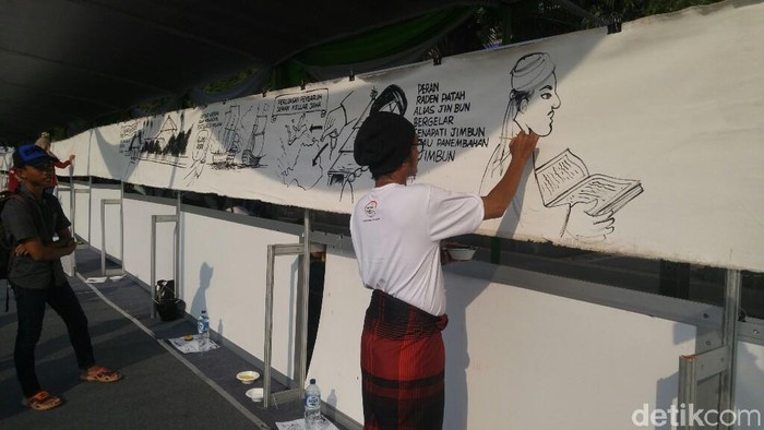 Sebanyak 31 komikus sudah mulai menggoreskan tintanya pada kanvas yang dibentangkan 2 sisi 150 meter di tepi lapangan sejak pukul 14.00 WIB siang tadi. Menteri Agama Lukman Hakim Saifuddin juga sempat menggoreskan tinta di kanvas untuk mengawalinya.