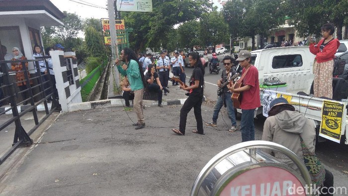 "Kami KEPAL SPI, menggelar konser di depan kantor Angkasa Pura, sebagai bentuk dukungan seniman kepada para petani di Kulon Progo yang masih mempertahankan lahannya dari ancaman penggusuran untuk lokasi bandara New Yogyakarta International Airport (NYIA)," kata salah satu personel KEPAL SPI, Tole, Kamis (14/12/2017).