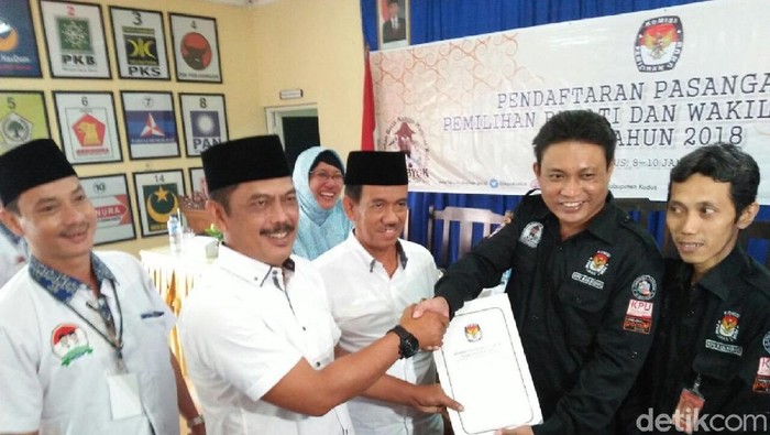 Puluhan pendukung dan simpatisan hadir mengiringi pendaftaran tersebut. Namun, hanya 20 orang yang bisa menemani pasangan itu mendaftar. KPU menerimanya di lantai 2 gedung aula di Jalan Ganesha, No 4, Purwosari, Kudus, Senin (8/1/2018).