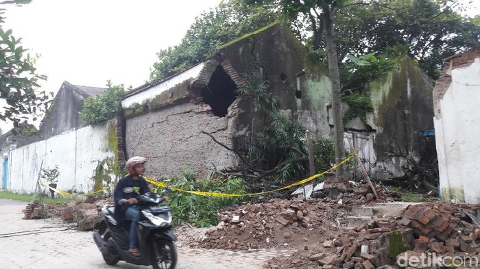 Pantauan detikcom, Selasa (16/1/2018) pagi, tembok sepanjang 10 meter dengan tinggi mencapai 5 meter itu ambruk ke arah jalan. Bagian yang roboh meliputi gapura kampung dan sebagian bangunan di kompleks Sasono Putro, kediaman raja Pakubuwono XIII.