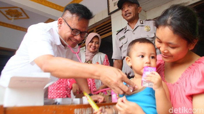 Selain melakukan pengobatan bersama Puskesmas Sidamulya, relawan ini juga membagikan susu kemasan dan makanan ringan. (sip/sip)