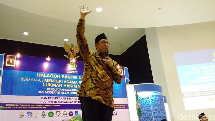 "Semua di sini santri kan, saya ingin tahu siapa di antara kita itu yang mengenal siapa itu Milea, yang tahu angkat tangan. Siapa itu Dilan?," tanya Lukman ketika kepada ratusan santri yang menghadiri acara Halaqah Santri Nusantara bertema Penguatan Wawasan Kebangsaan dan Moderasi Islam untuk Generasi Milenial, di Universitas Islam Negeri (UIN) Sunan Kalijaga Yogyakarta, Rabu (28/3/2018).