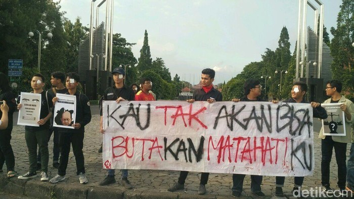 Pantauan detikcom, dalam aksinya beberapa mahasiswa membentangkan spanduk dan membawa sejumlah poster. Spanduk tersebut bertuliskan 'Kau tak akan bisa butakan mata hatiku' dengan tinta hitam dan merah.