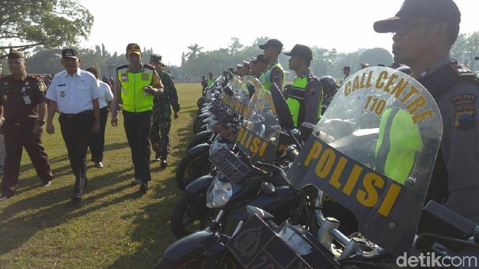 Suasana pemeriksaan pasukan pada gelar ops ketupat candi 2018 oleh Kapolres Purworejo AKBP Teguh Tri Prasetya. Foto: Rinto Heksantoro/detikcom