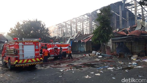Tampak beberapa mobil damkar masih mondar-mandir di Pasar Legi. Petugas terus menyiramkam air ke arah bangunan pasar.